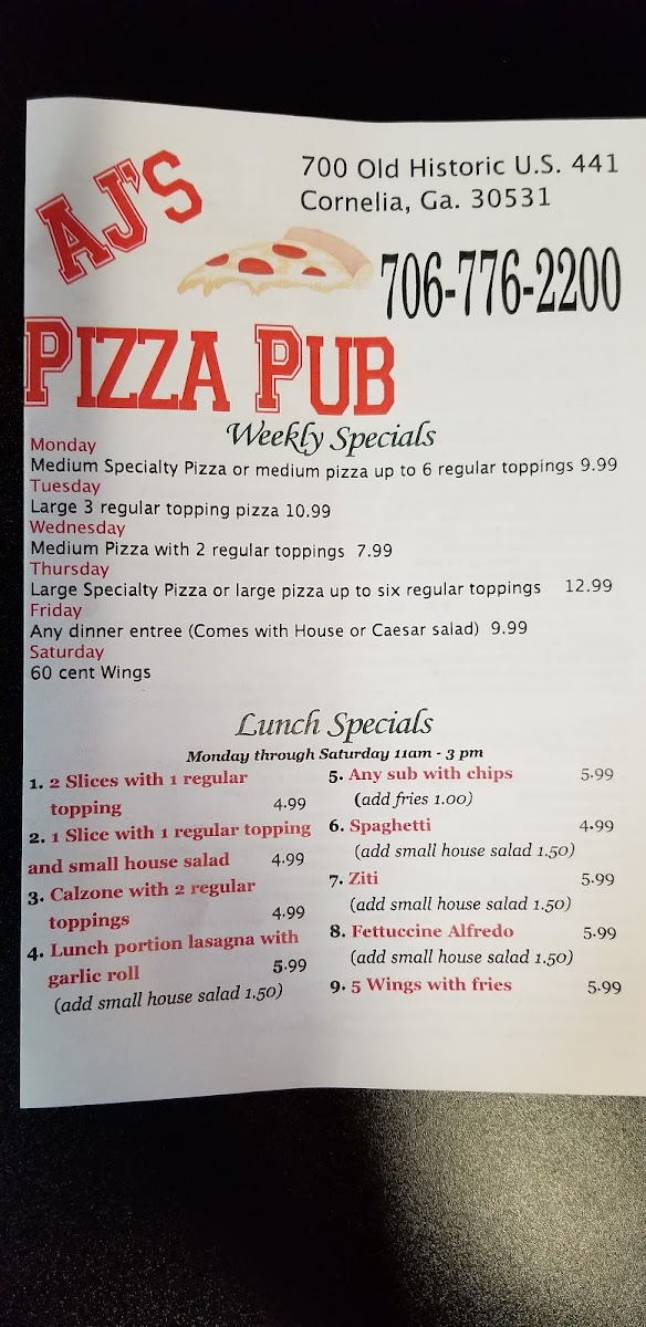Welcome to AJ's Pizza Pub, a culinary gem nestled in Cornelia, GA. Known for its enticing menu, AJ's offers a delightful fusion of classic and innovative Italian dishes, featuring everything from fresh salads like the Greek Salad to hearty entrees such as Lasagna and Chicken Parmigiana.