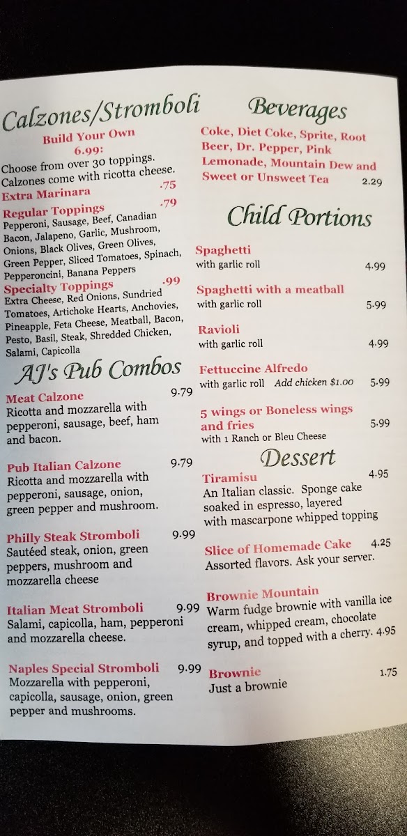 AJ’s ambiance combines a relaxed sports bar feel with friendly service, making it a perfect spot for a casual outing. Whether you're grabbing a quick bite or enjoying a leisurely meal with friends, AJ's Pizza Pub promises satisfaction with every visit.
